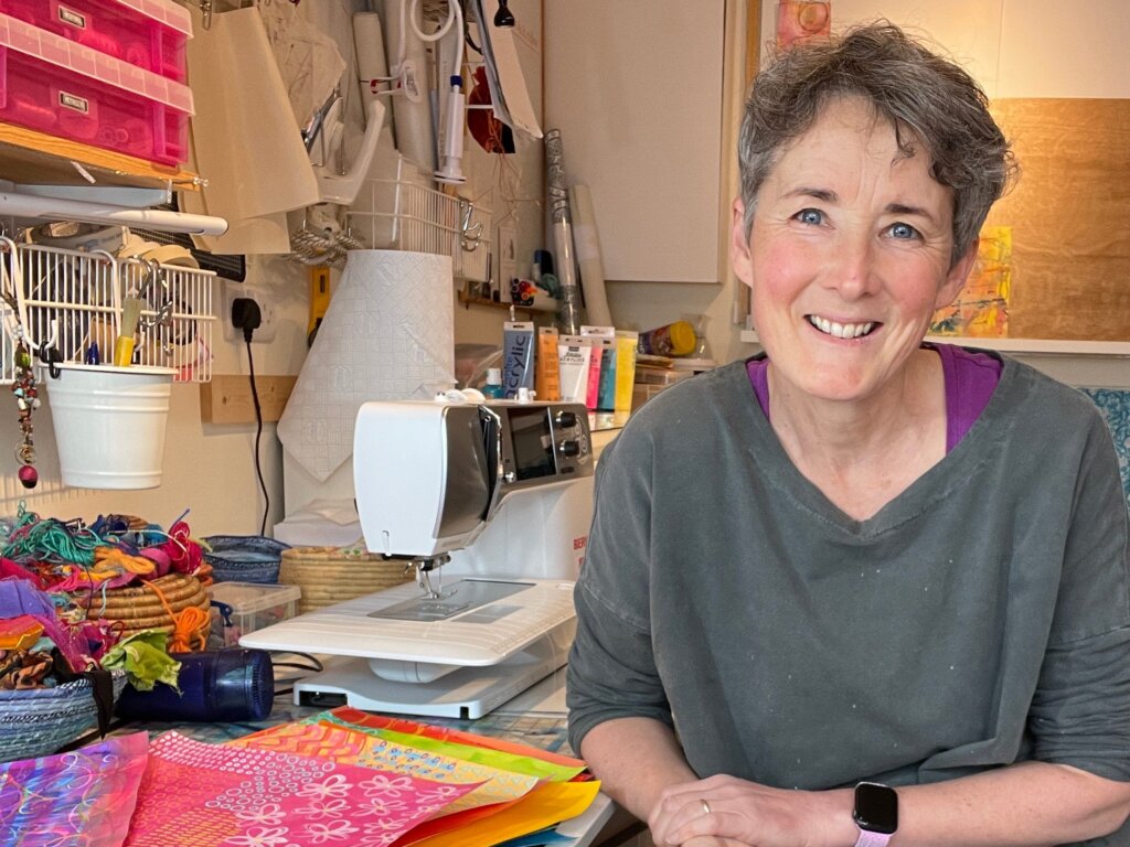 I’m an artist mostly using textiles and collage, always colourful. My favourite materials are paint and paper, recycled fabrics and threads, music and maps, and a scattering of beads, and buttons. My favourite techniques mix it all up with collage, embroidery and appliqué.