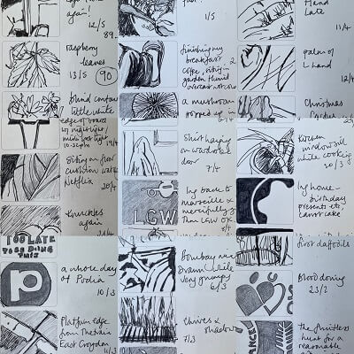 Drawing something that’s right in front of me, like I did for my #100dayproject drawings, is hard! So I have to look carefully. I can’t think at the same time. Could be blind contour drawing, or thumbnail sketching or timed drawings e.g. Gabriel Lipper’s 5 minute drawings. It doesn’t have to be related to what I want to do, it could just be drawing my hand. Drawing from life shuts up the thinking bit of my head, I’m occupied in looking and recording, so I can’t think at the same time.