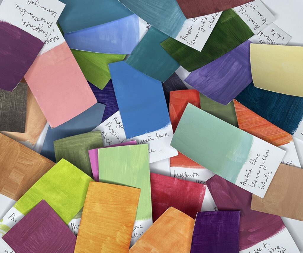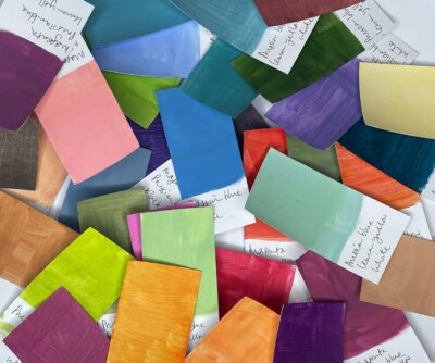 After a bit of loosening up, I might start to play with colours. Colour mixing using a limited palette is fantastic. Louise Fletcher teaches this in her course, but her YouTube videos are also great at explaining how to use a limited palette. I might paint swatches into a sketchbook or onto strips of card (and label them) or directly onto paper.