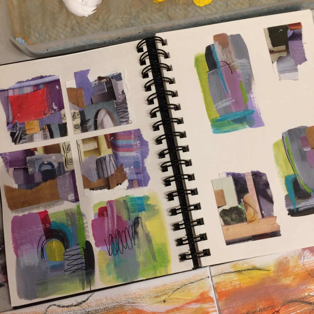 So yesterday I cracked open the paints and gel medium and had a little play, just a warm up if you like. I started with an interiors magazine, bought specifically for the interesting colours and patterns that may lurk within, and stuck down a few random collages on some pieces of failed gelli prints (which is almost everything I ever do with a gelli plate – another thing on the To Do list to master). I cut a few of the collages up to rearrange them, and then added them to a sketchbook.