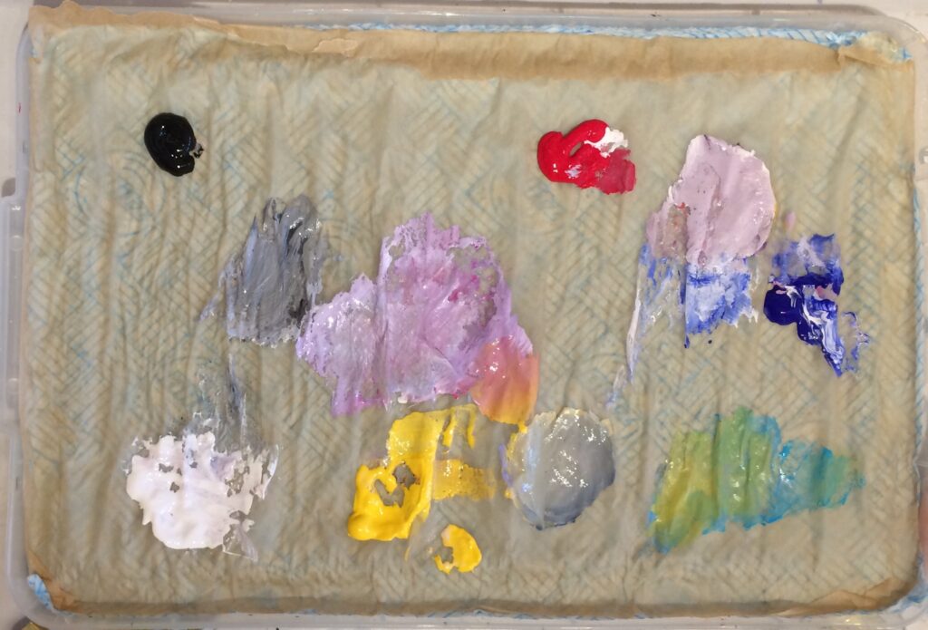 Inspired by the greys and lilacs in the collages, I squeezed out a big dollop of white (a huge 500ml bottle being one of my Christmas gifts), a squirt of ultramarine, a dab of magenta, a smidge of naples yellow and the merest hint of black. There was also a tiny bit of turquoise on the palette* already.