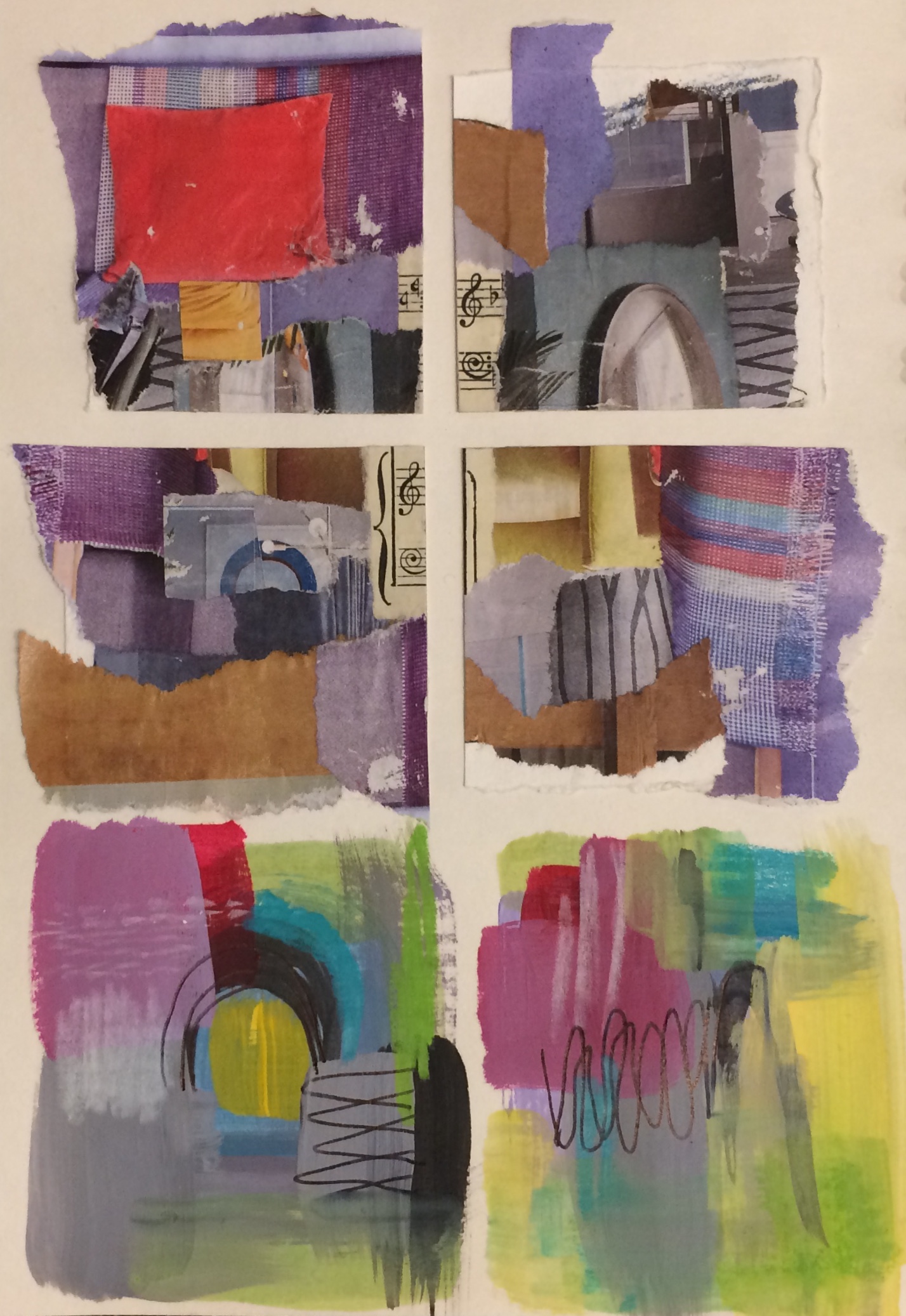 So yesterday I cracked open the paints and gel medium and had a little play, just a warm up if you like. I started with an interiors magazine, bought specifically for the interesting colours and patterns that may lurk within, and stuck down a few random collages on some pieces of failed gelli prints (which is almost everything I ever do with a gelli plate – another thing on the To Do list to master). I cut a few of the collages up to rearrange them, and then added them to a sketchbook.