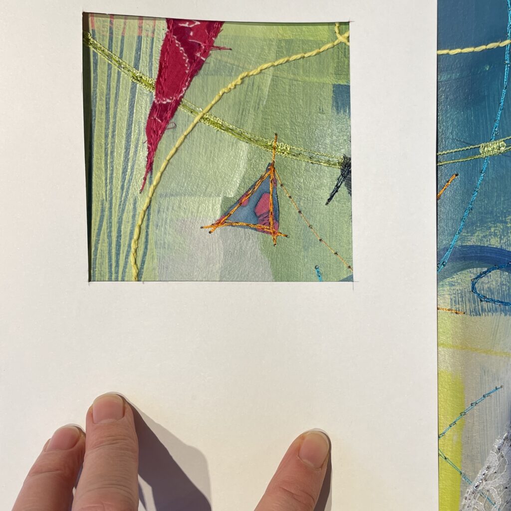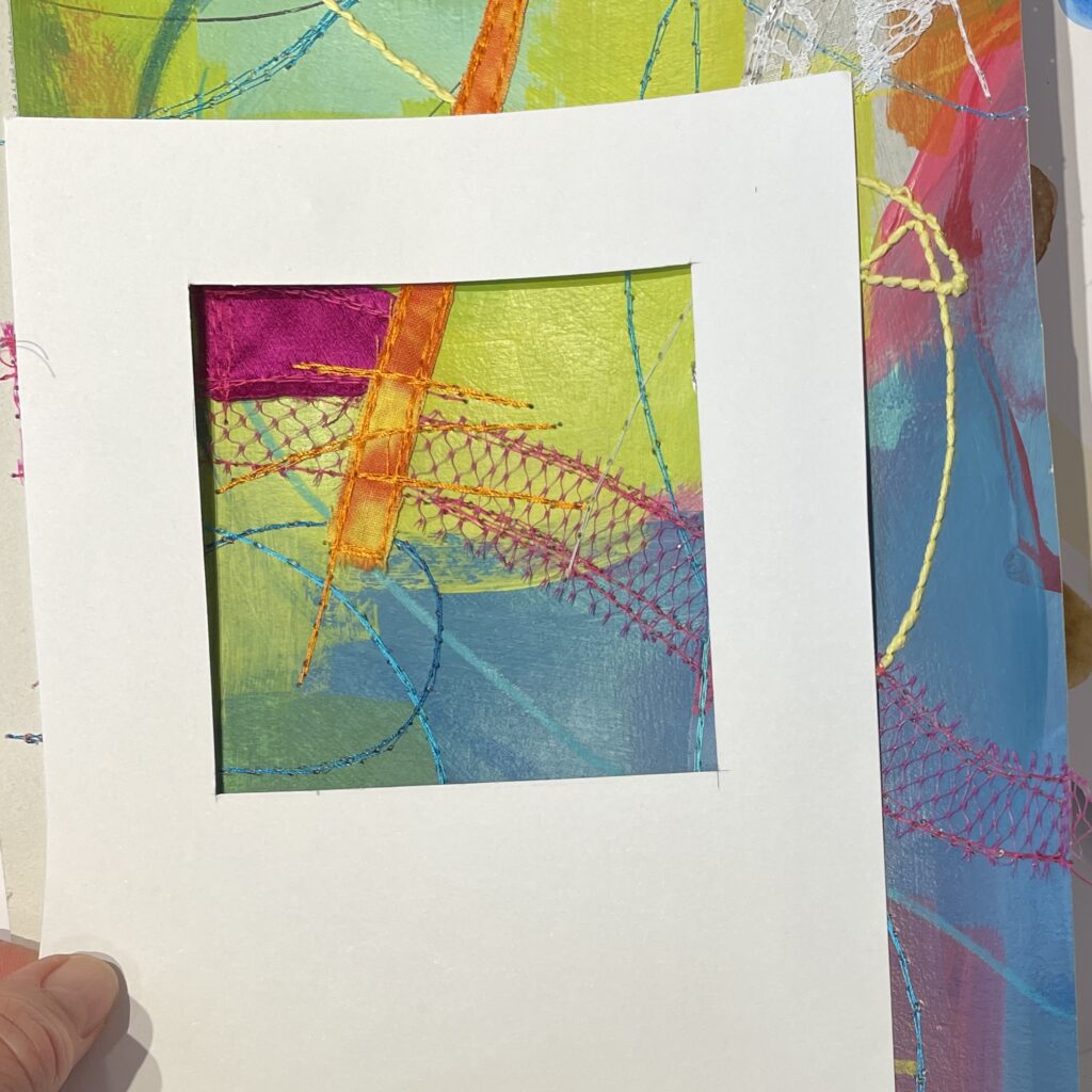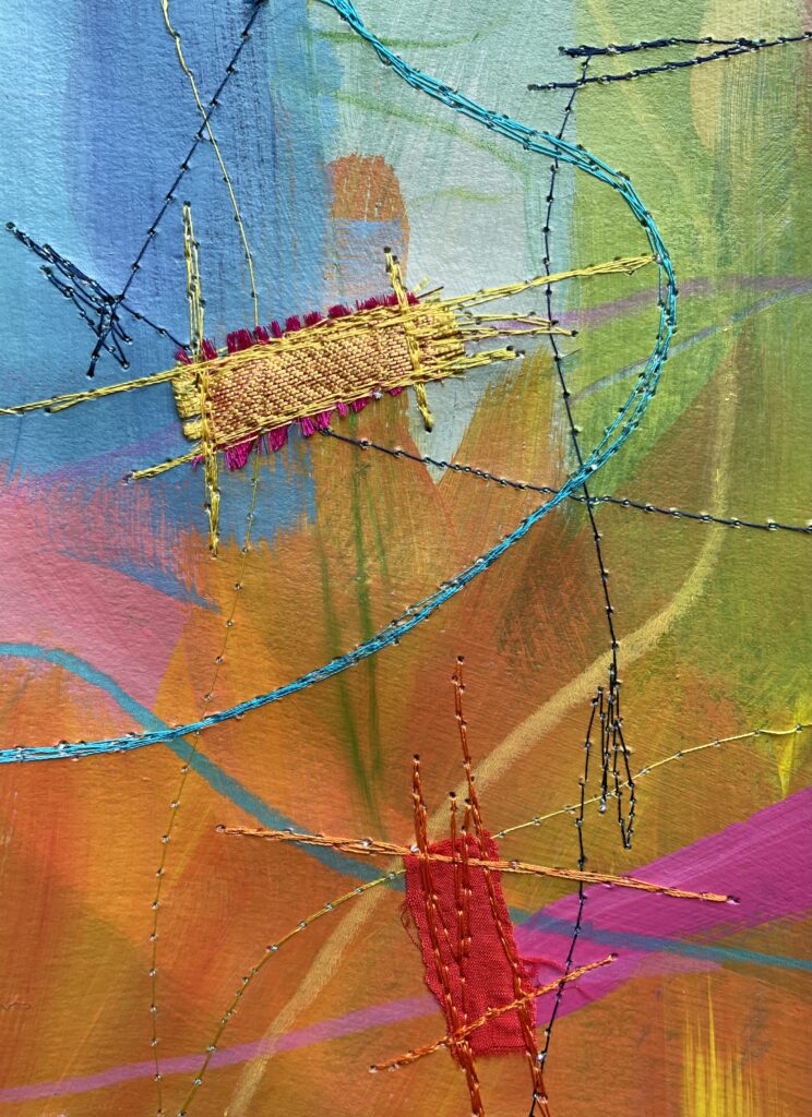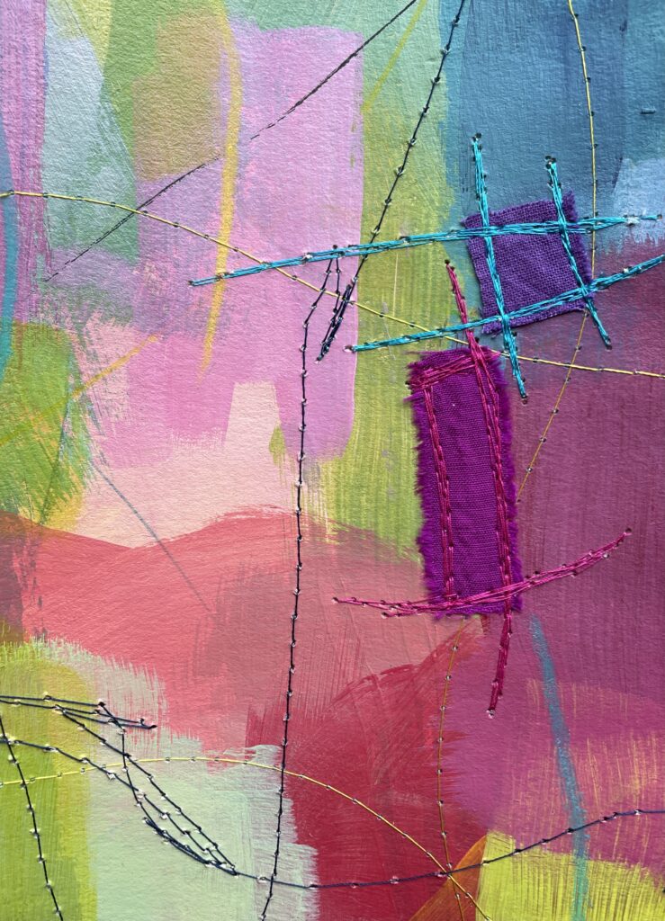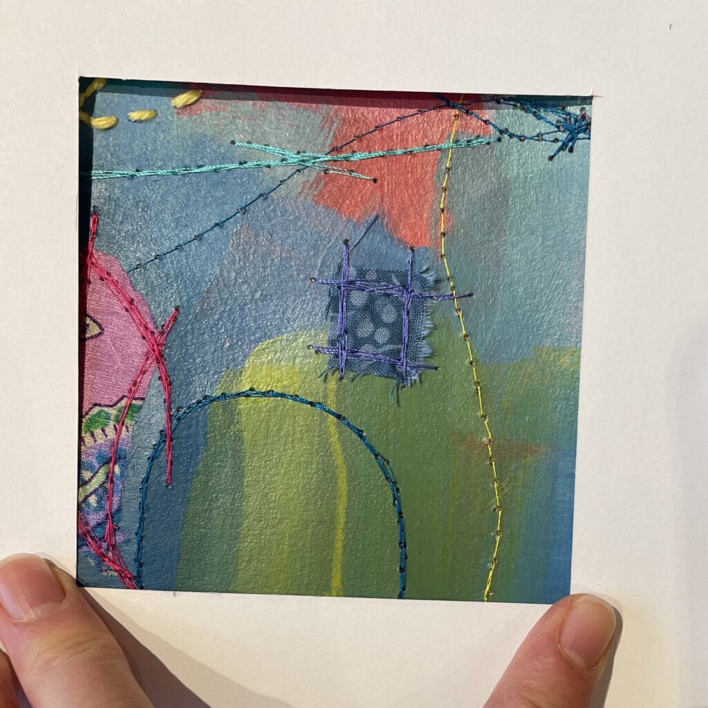 Just like back when I’d painted the paper, choosing fabric snippets and thread and lines and marks became a puzzle – something to solve. Finding the “right” colour to layer on next felt like solving the next clue, filling in another word in a crossword.
