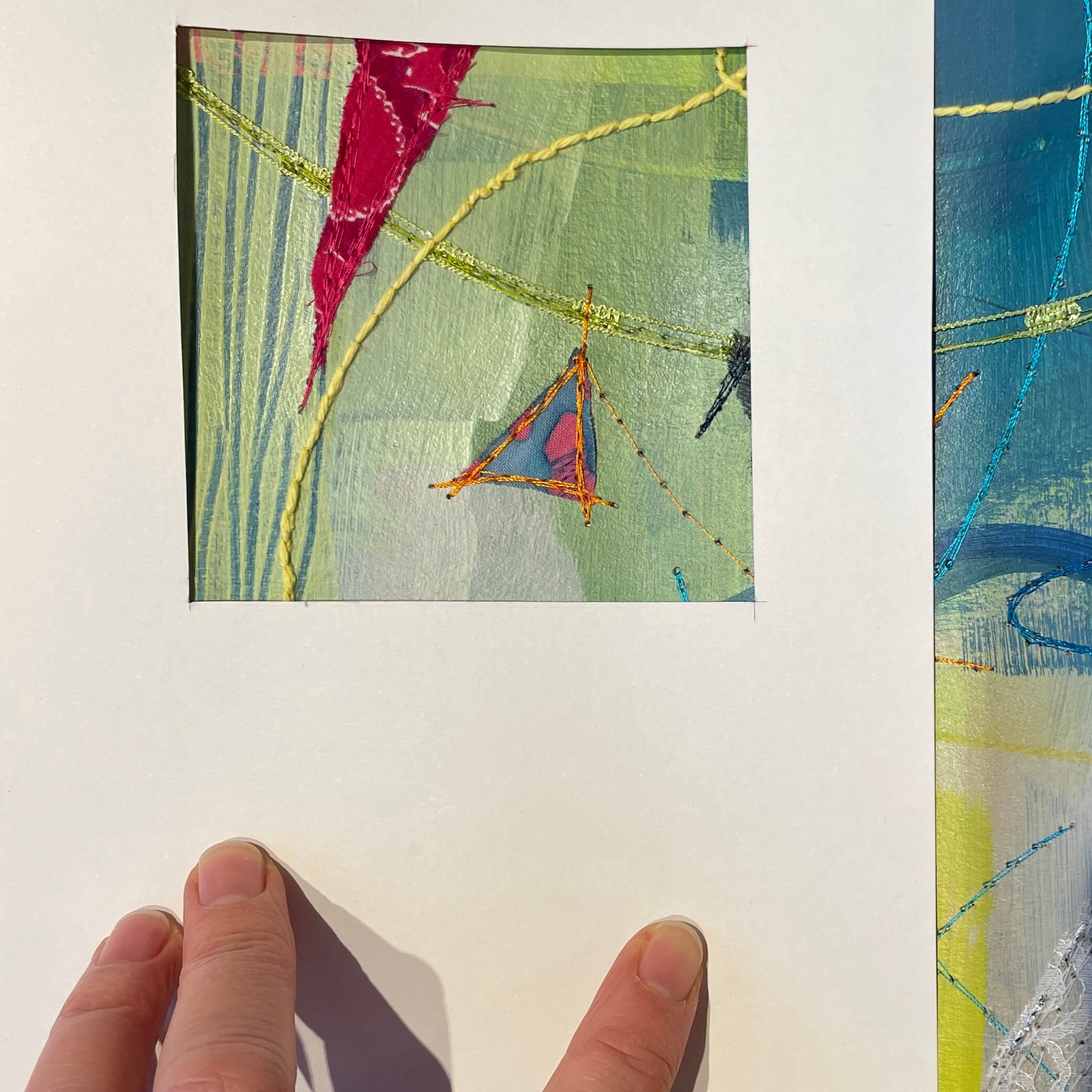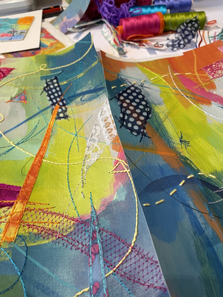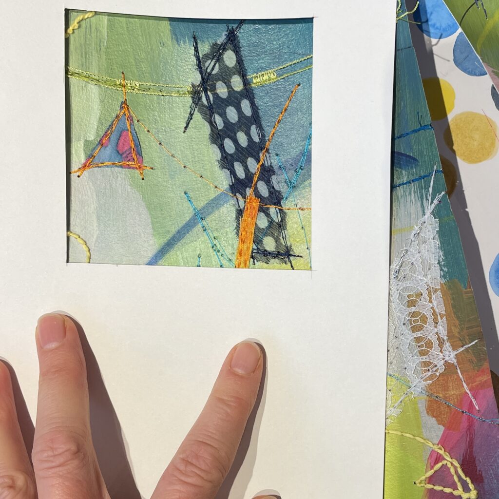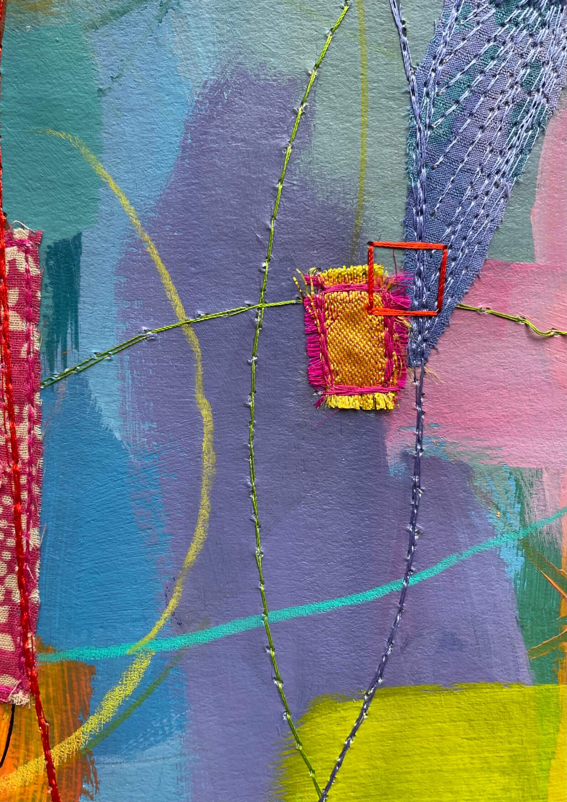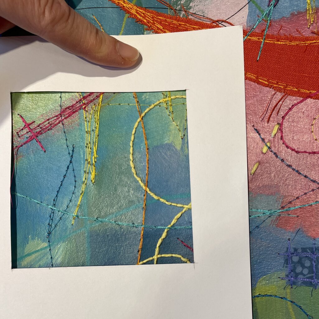 Just like back when I’d painted the paper, choosing fabric snippets and thread and lines and marks became a puzzle – something to solve. Finding the “right” colour to layer on next felt like solving the next clue, filling in another word in a crossword.