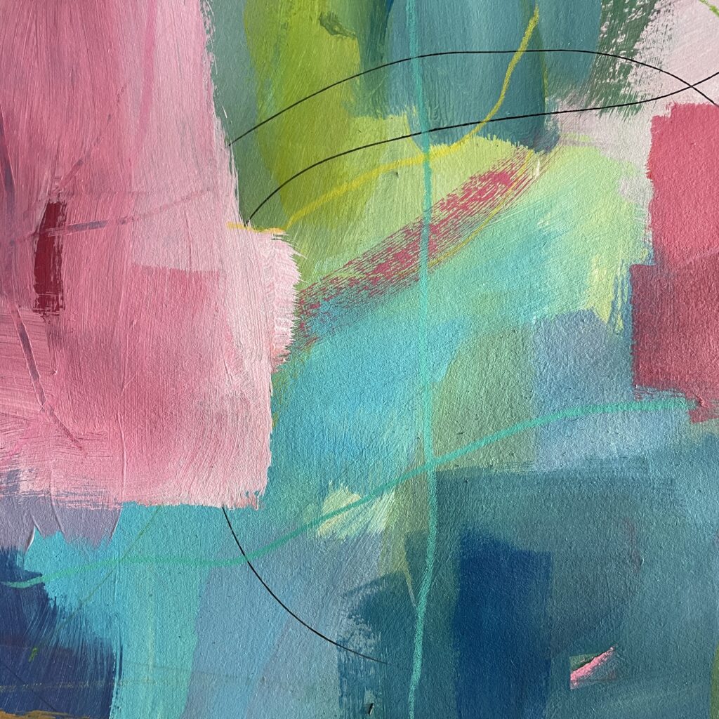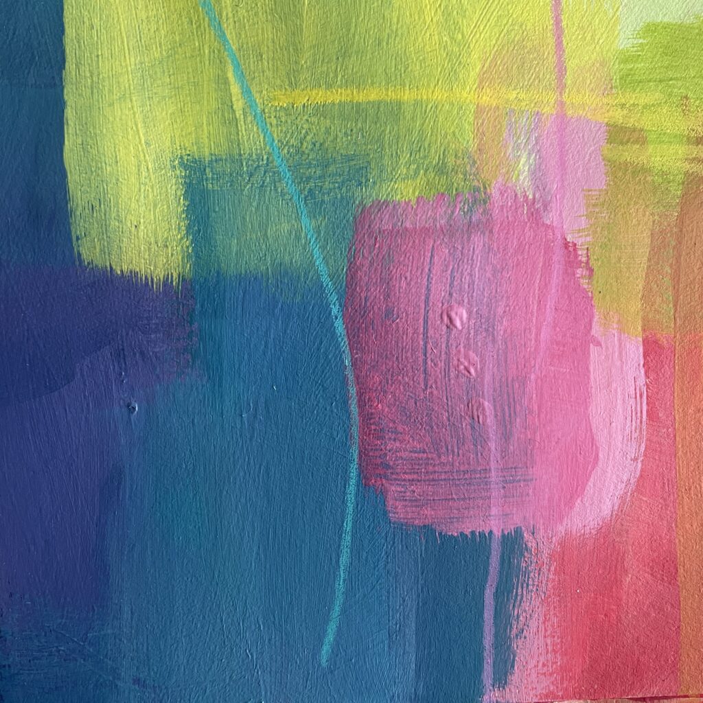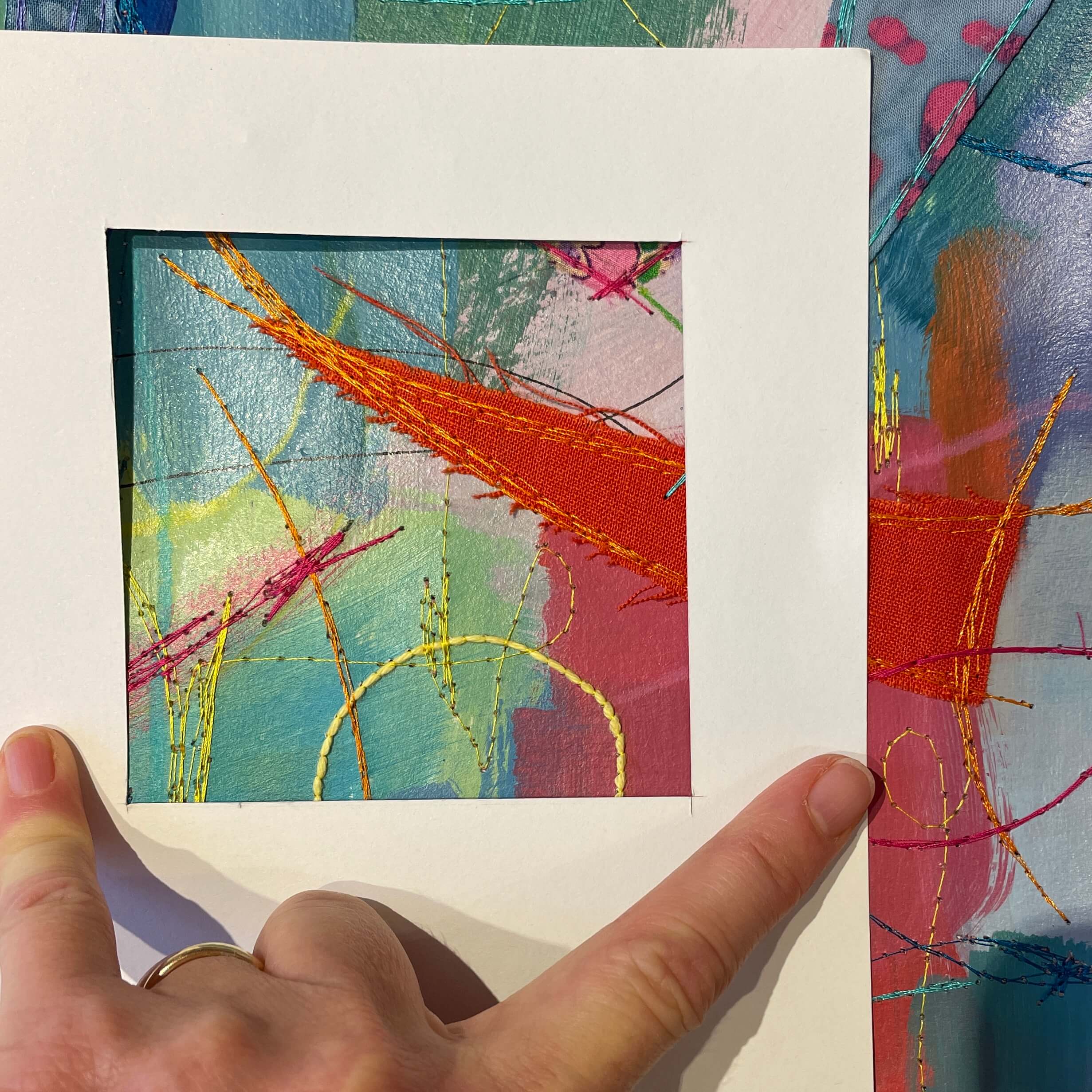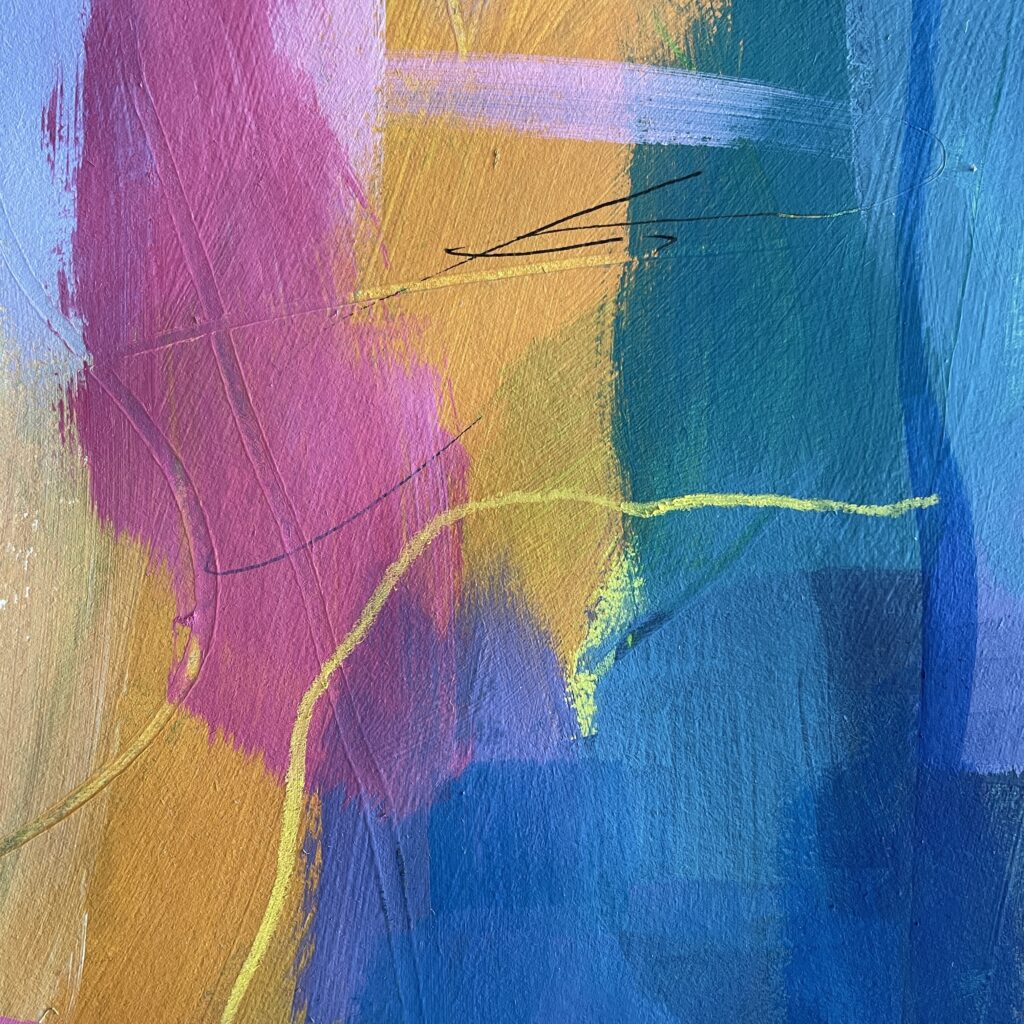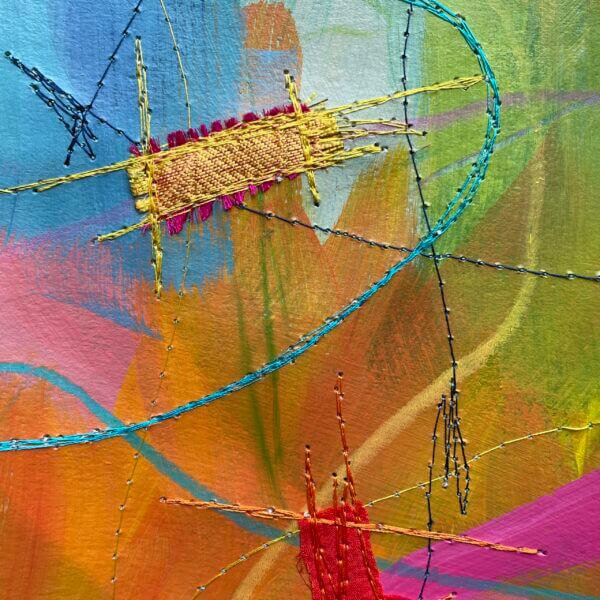 Just like back when I’d painted the paper, choosing fabric snippets and thread and lines and marks became a puzzle – something to solve. Finding the “right” colour to layer on next felt like solving the next clue, filling in another word in a crossword.