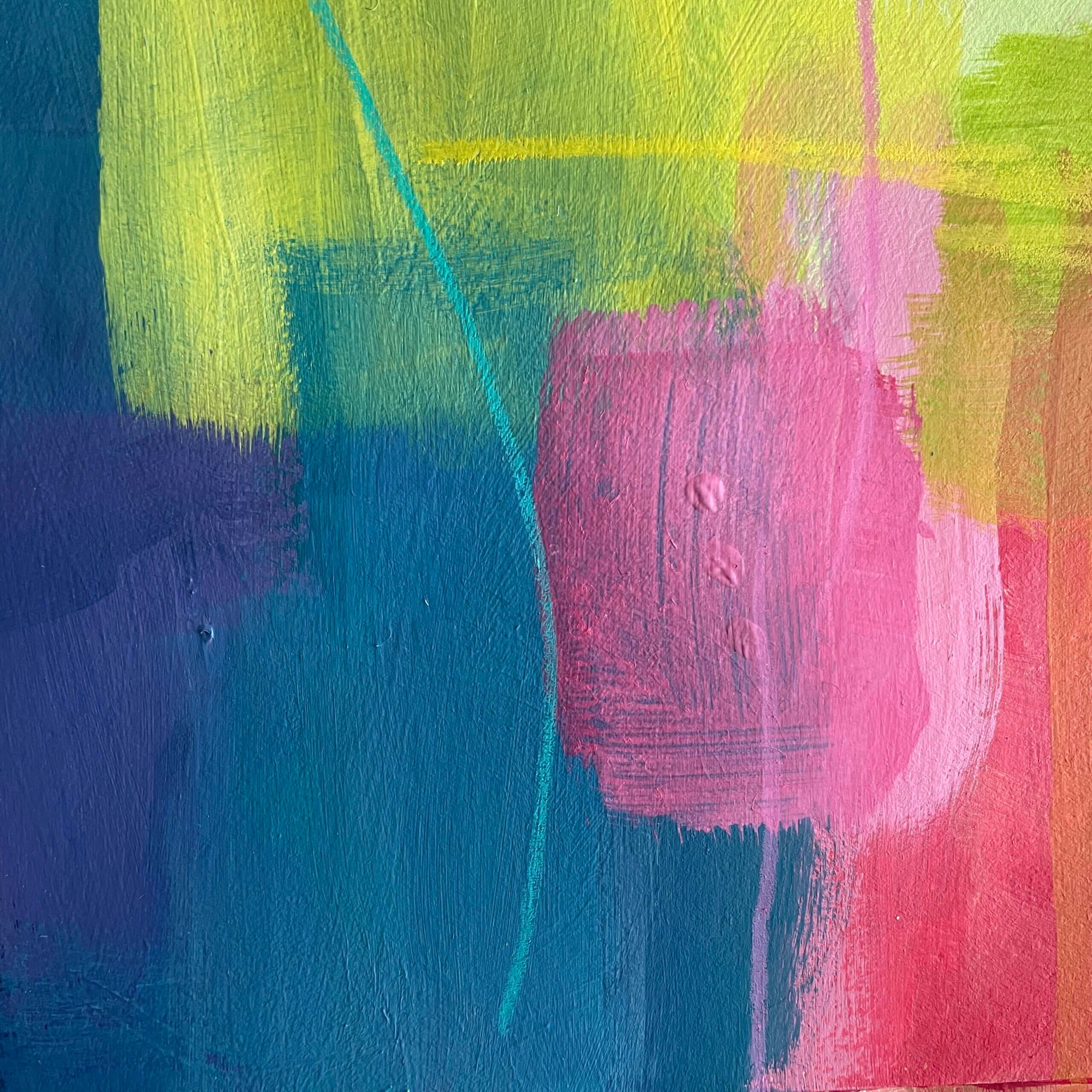 The paper began life as a colour mixing exercise: using a limited palette (one red, one blue, one yellow, black and white) seeing how many different colours I could create, and how they looked next to each other. When the paint was dry, I really enjoyed layering on more colour using my favourite Woody pencils (more crayon than pencil, so yummy to use).
